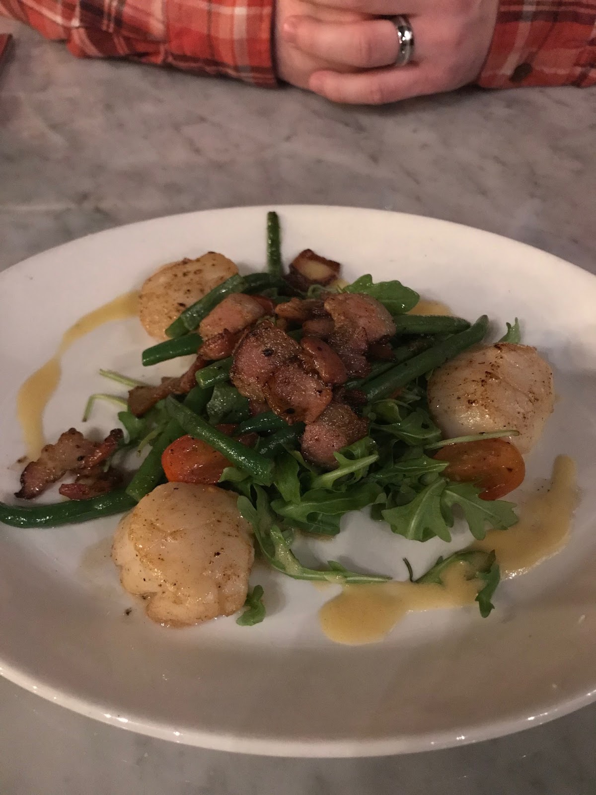 | Seared Scallops and Crispy Bacon app - haricots verts, arugula, grape tomatoes